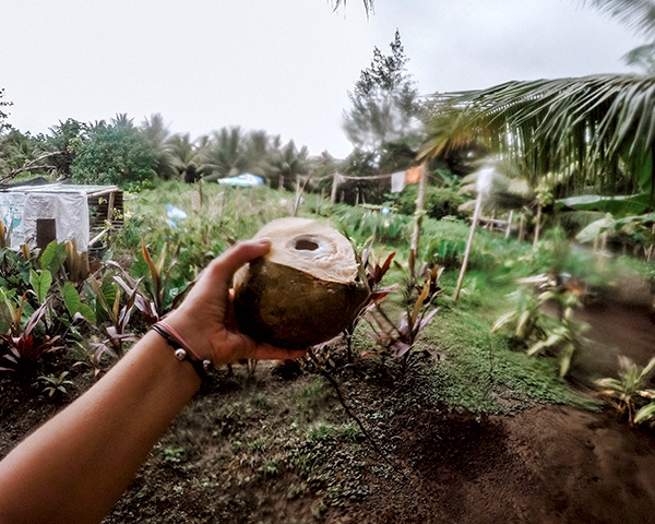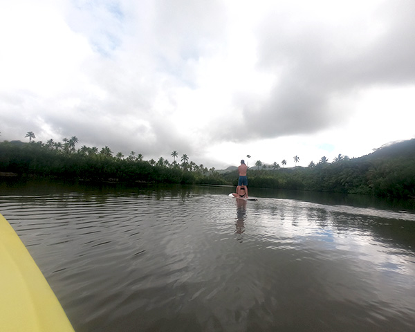 Salida a vela a las 11:00 para llegar a la bahía de Faaroa, donde el mar se encuentra con un río que remontamos en kayak y paddle. Tomando el primer brazo a la derecha, llegamos a un callejón sin salida y descubrimos una pequeña vivienda donde vive una pareja. Nos ofrecieron agua de coco abierto en el momento. ¡La verdadera definición de «vivir de amor y agua fresca«!