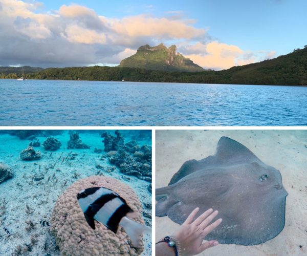 Salida a las 6:00 para nada menos que 7 horas de navegación para llegar a la famosa isla de Bora Bora. Primer fondeo detrás de Toopua, otro motu. Tomamos el flotador para llegar a la parte más clara y arenosa de la laguna. Aquí es posible tocar fácilmente el fondo y nadar junto a tiburones de punta negra y rayas. Normalmente es una excursión que ofrecen los hoteles a 85€ por persona, ¡pero la ventaja del barco es que puedes ir gratuitamente!
