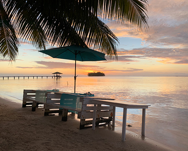 El vuelo a Huahine duró unos 20 minutos, lo que nos permitió llegar al hotel «Le Mahana«, gestionado por nuestro socio, justo a tiempo para contemplar una magnífica puesta de sol. En la Polinesia da la impresión de que el sol cae rápidamente sobre el océano; la luz es muy intensa y tropical, ¡ideal para las fotos! 🌺📸