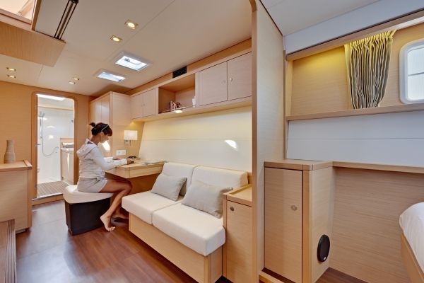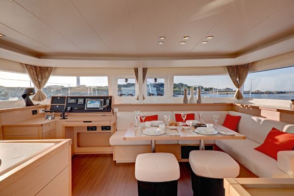 - El salón central es el corazón de la vida a bordo: luminoso, espacioso, conectado directamente con la bañera de popa, donde se come, se conversa y se contemplan los atardeceres.