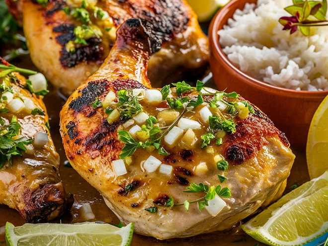 1. Marina el pollo con ajo, lima, tomillo, sal y pimienta durante 30 minutos